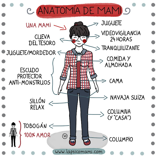 Tu post es el regalo del día de la madre: reconocimiento con humor y cachondeo sobre nuestras (des) gracias. Muy genial, como siempre. Y tan lejano del disfraz de boda que me pongo el sábado, que tiemblo… ¿Dónde meteré los pañuelos usados? ¿En el zapato de 8 cm de tacón? ¿Dónde guardaré juguetes? ¿En el tocado? ¿Qué tipo de argamasa será necesaria para tapar mis agujeros negros también conocidos como ojeras?
